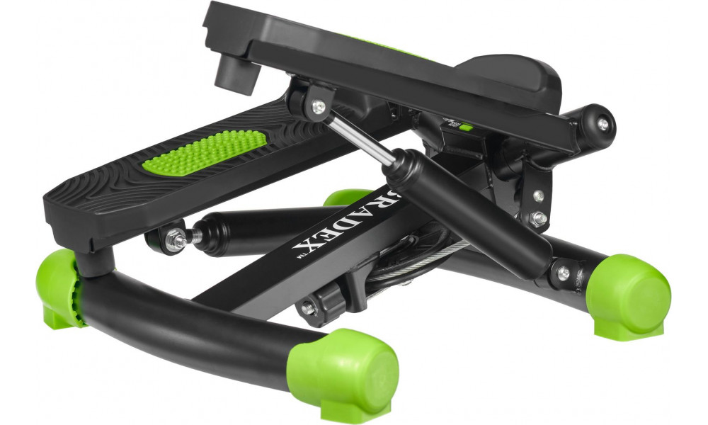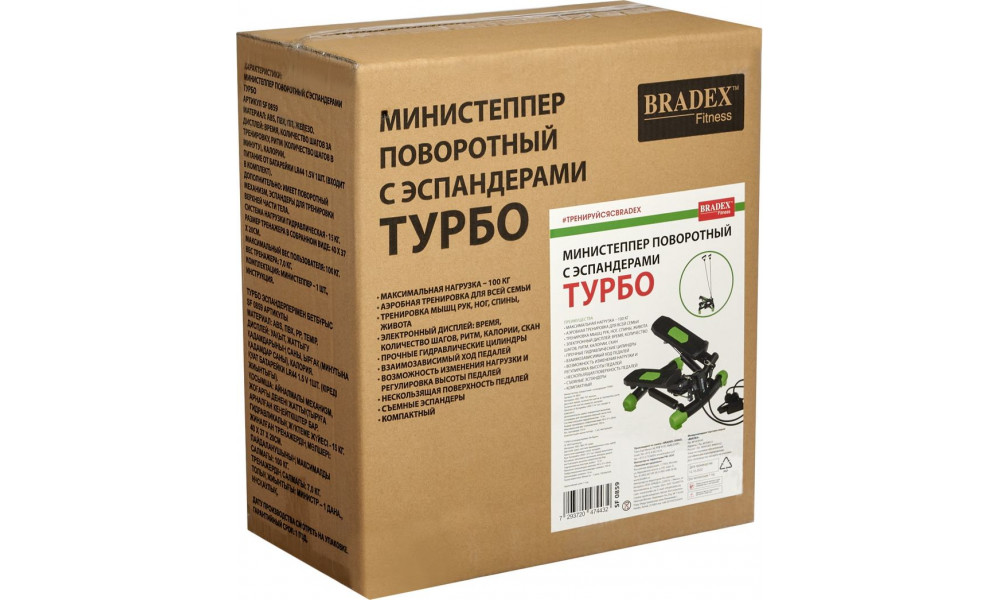 Министеппер поворотный с эспандерами Турбо – функциональный тренажер для аэробных упражнений дома для всей семьи. Он имитирует подъем по лестнице со ступени на ступень и помогает прорабатывать мышцы ног, рук, спины, пресса, снижать лишний вес. Дисплей с LED-монитором показывает параметры тренировки: время, ритм, общее количество шагов и калории. Он может сохранять данные пользователя для планирования следующей тренировки. Электронный дисплей работает от одной мизинчиковой батарейки, которая входит в комплект. Гидравлическая приводная система обеспечивает стабильное и безопасное использование тренажера. Внутренняя пружина защищает суставы и обеспечивает хороший амортизирующий эффект. Стальная конструкция обладает высокой устойчивостью и выдерживает вес до 100 кг. Большие удобные педали имеют нескользящую поверхность. Два съемных эспандера отлично подходят для тренировки рук и проработки мышц во всех направлениях. Регулярные тренировки с использованием министеппера укрепляют сердечно-сосудистую систему: улучшается кровообращение, лимфодренаж и метаболизм. Степпер поможет сделать мышцы тела рельефными и сильными, справиться с гиподинамией. Тренажер отличается эргономичным дизайном и отлично вписывается в любой интерьер. ПРЕИМУЩЕСТВА: Максимальная нагрузка – 100 кг Аэробная тренировка для всей семьи Тренировка мышц рук, ног, спины, живота Электронный дисплей: время, количество шагов, ритм, калории, скан Прочные гидравлические цилиндры Взаимозависимый ход педалей Возможность изменения нагрузки и регулировка высоты педалей Нескользящая поверхность педалей Съемные эспандеры Компактный